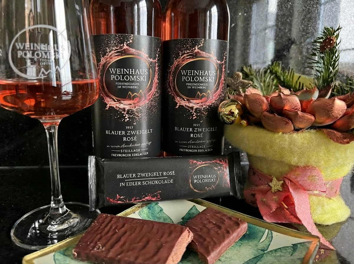 Ein exklusives Genussprodukt: eine cremige Füllung vom Roséwein Blauer Zweigelt, umhüllt von feinster Vollmilch-schokolade mit einem Kakaogehalt von 41% - der blanke Genuss solo oder zum Wein genossen